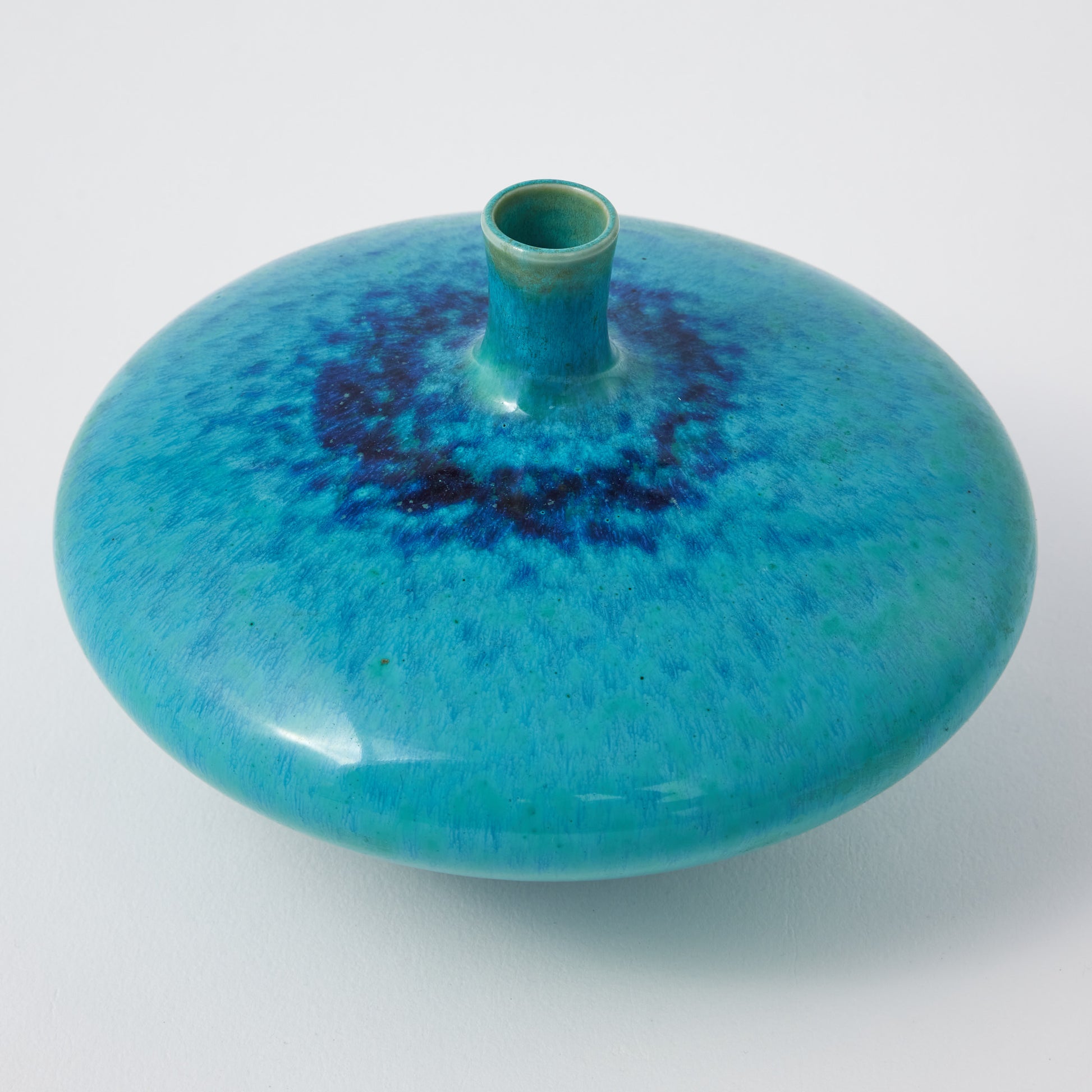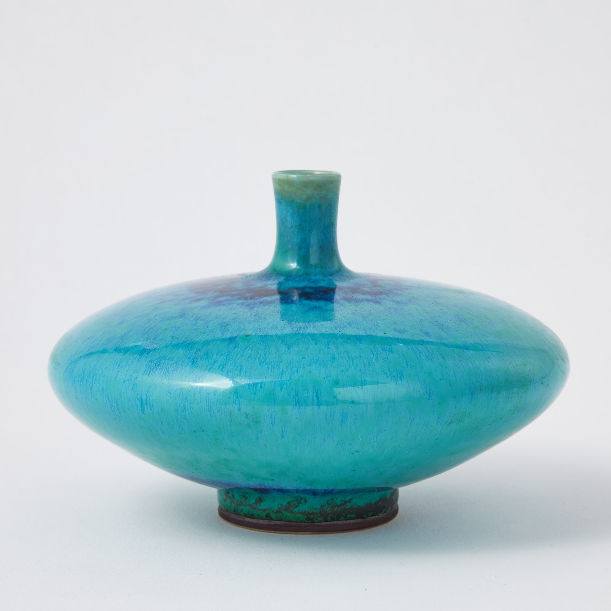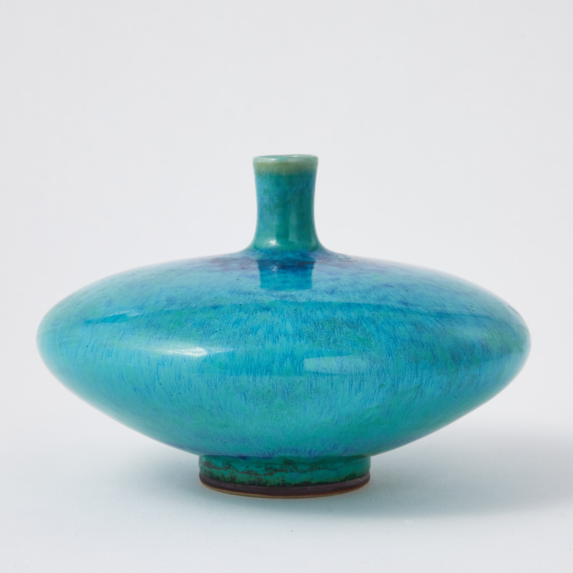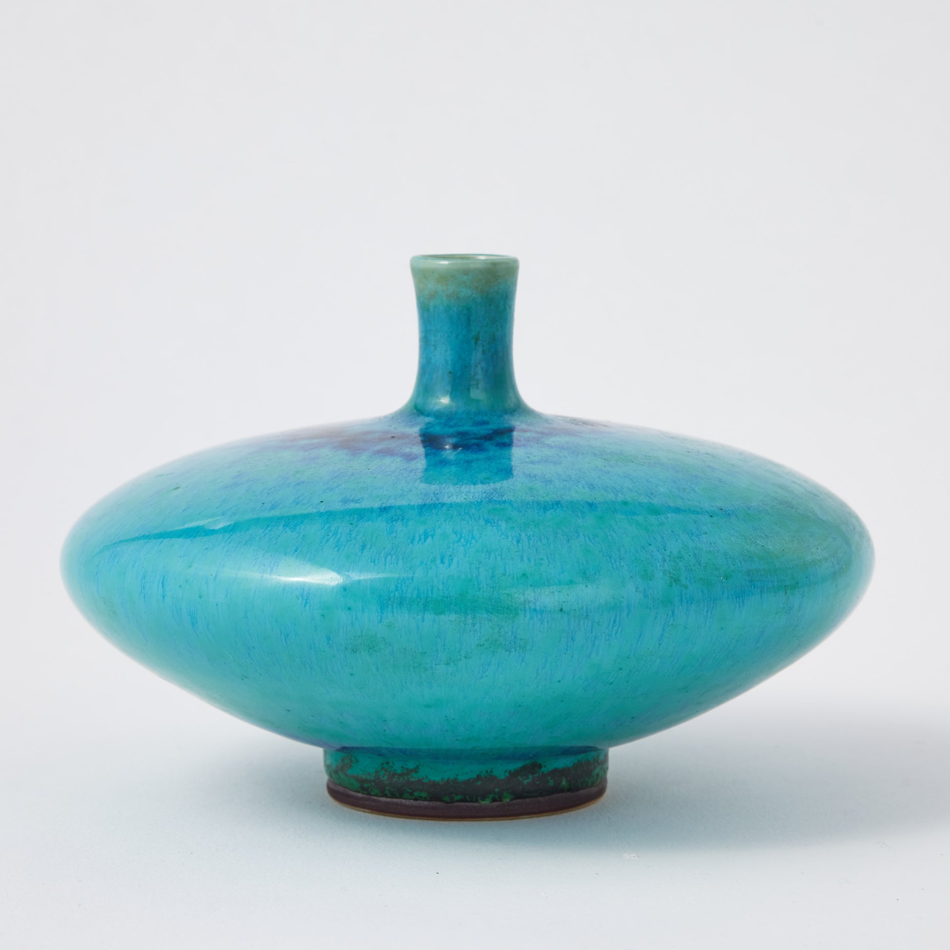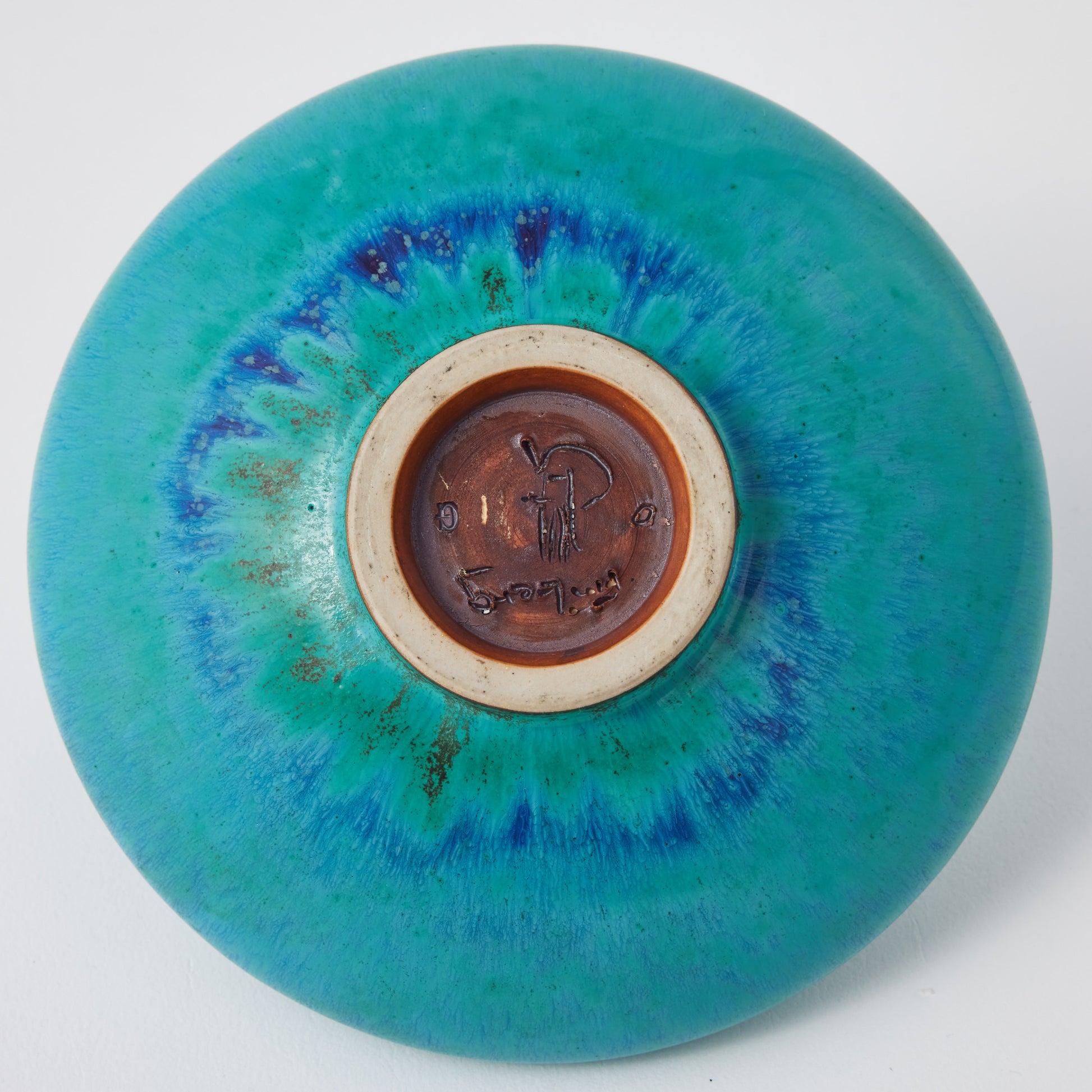 Stengodsvas diskus från Gustavsberg av Berndt Friberg med blank aniaraglasyr. 11 centimeter hög och diameter 16,5 centimeter. Signerad Friberg samt Studiohanden.