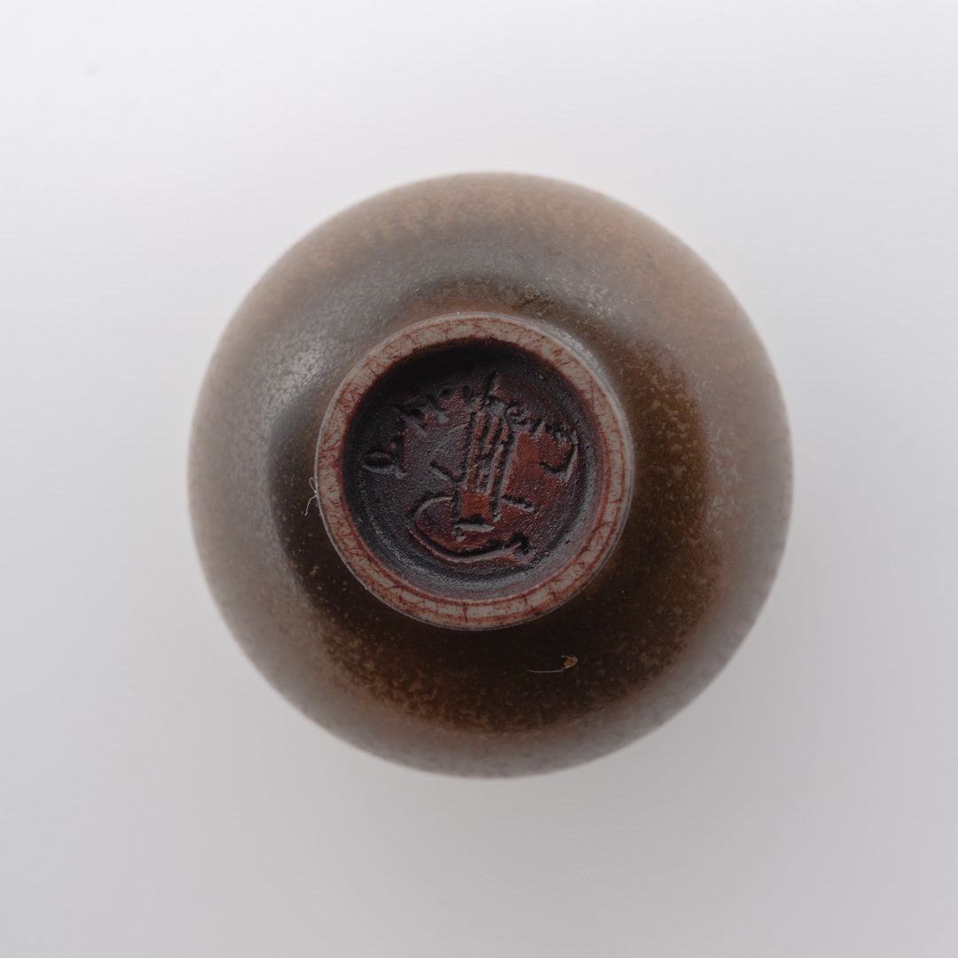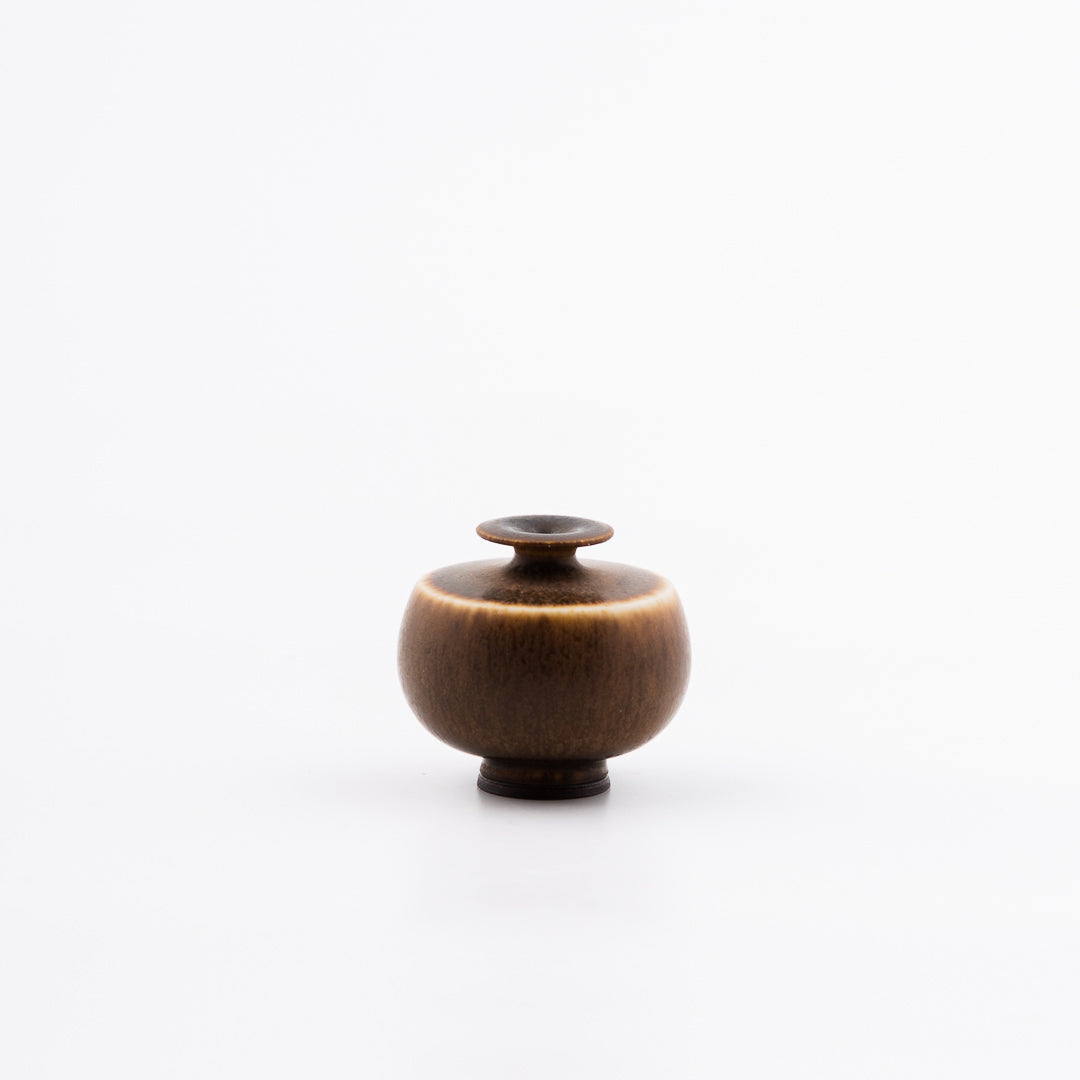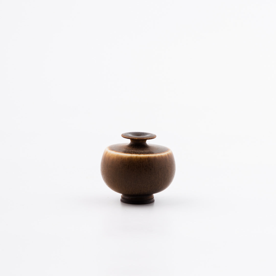 Stoneware vase by Berndt Friberg for Gustavsberg. Hare fur glaze. H: 3.2cm/1.3″. Signed Friborg and the Studio Hand .
