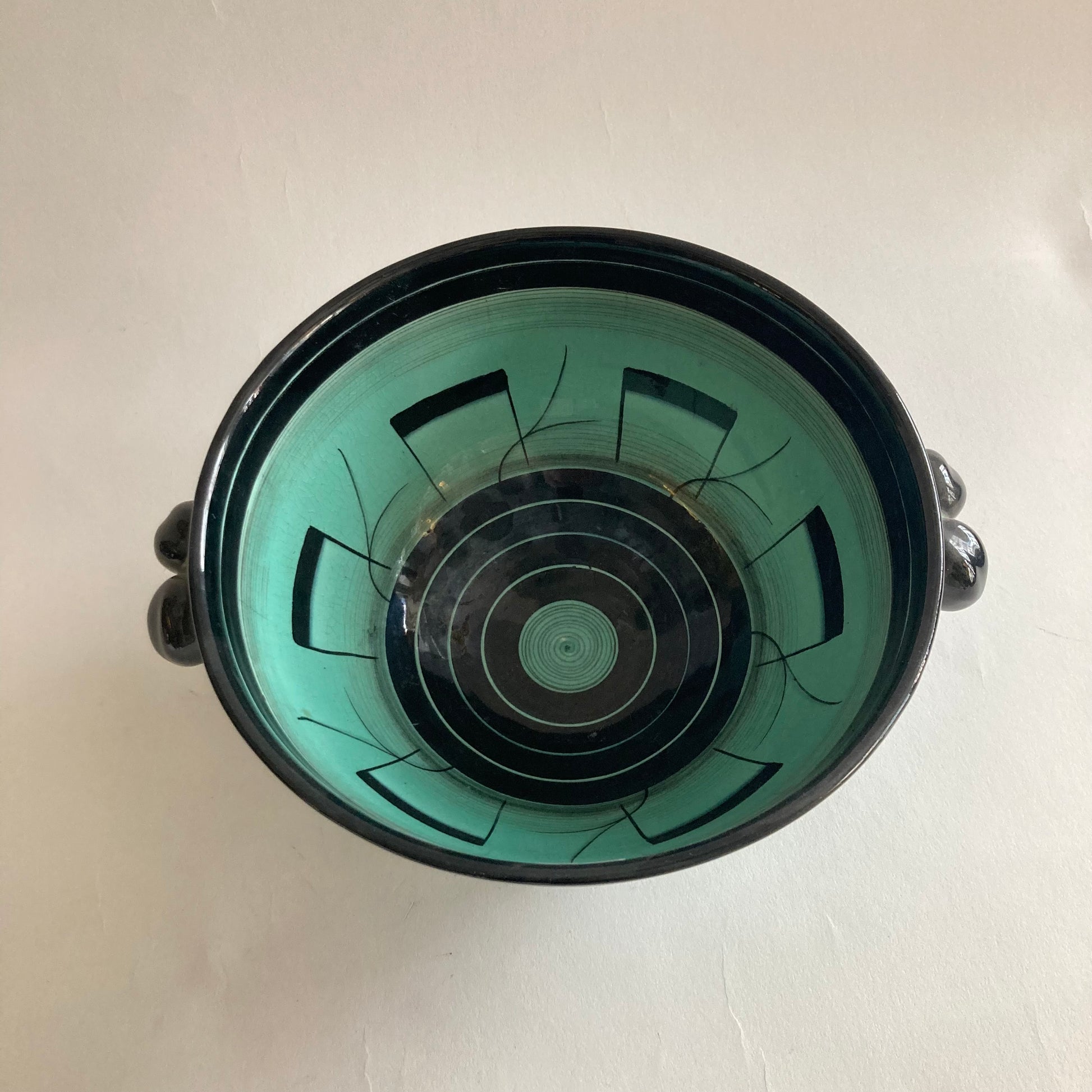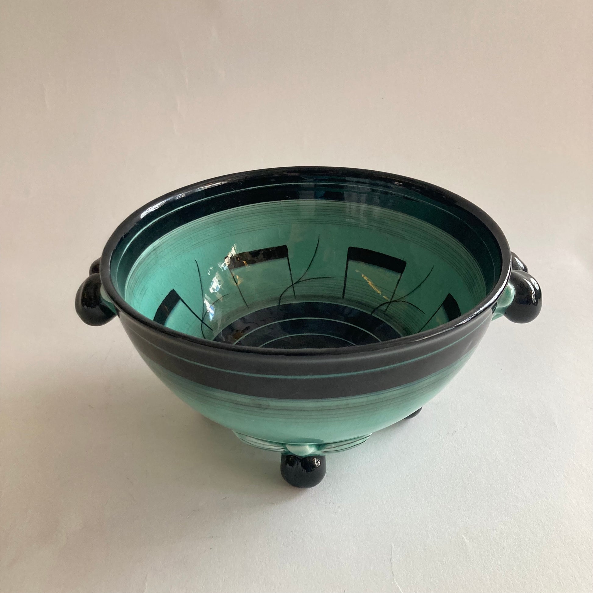 Skål av Ilse Claesson i Serie 5 för Rörstrand, 1930-tal. Höjd 12cm och skålens diameter utan handtag 20,5cm. Signerad IC Rörstrand.