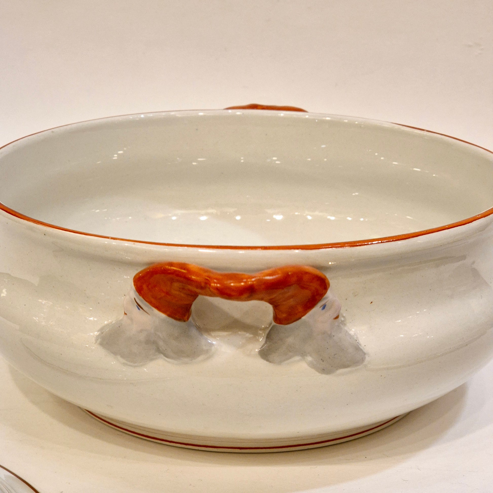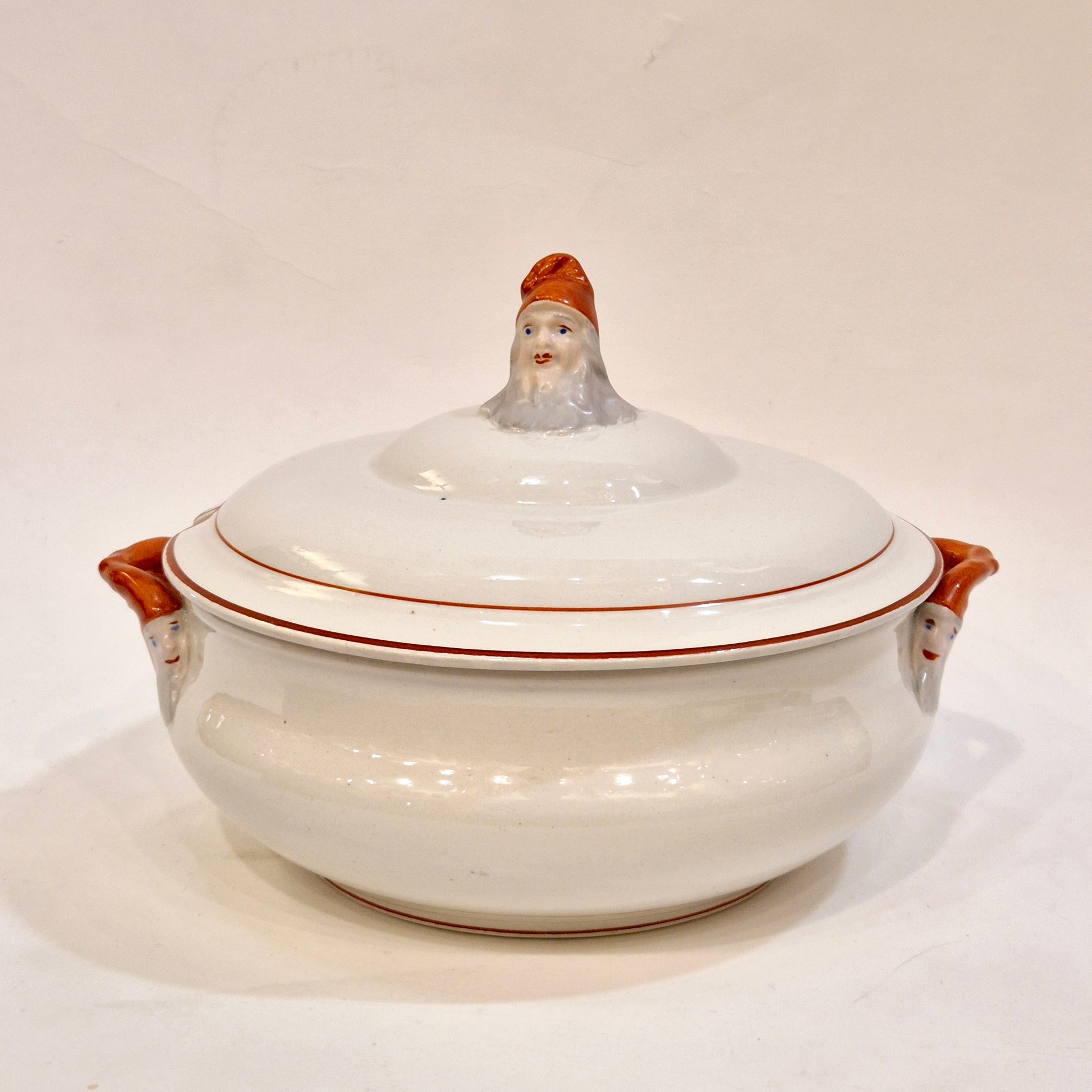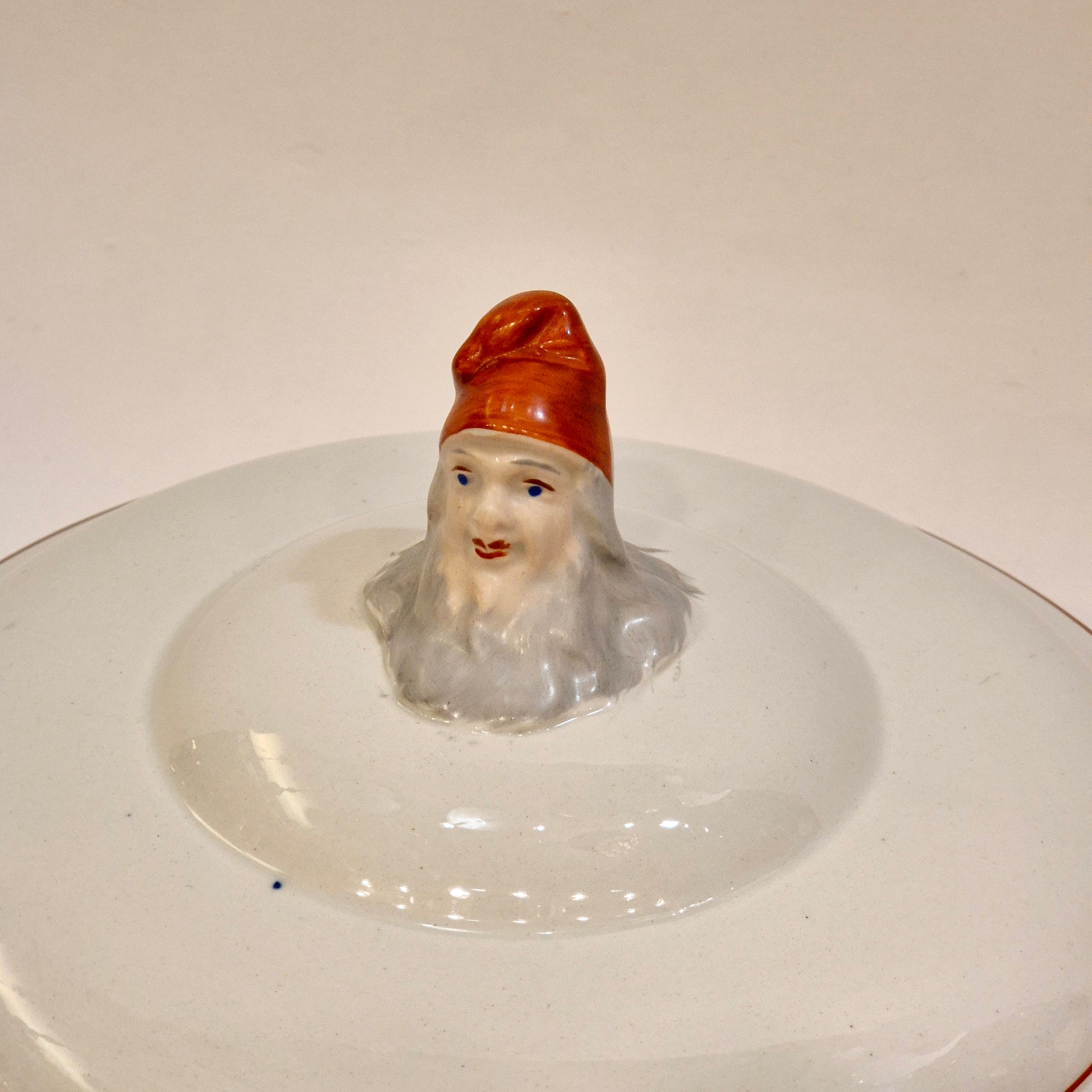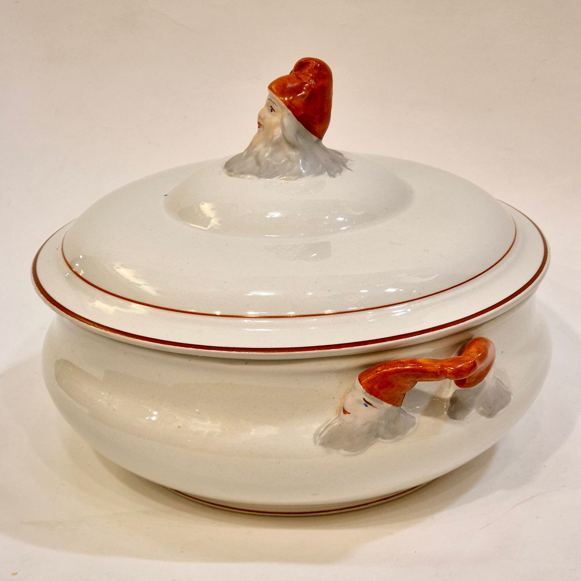 Terrin karott med lock och motiv med tomtar. Rörstrand, 1920-tal. Åldersrelaterat slitage.