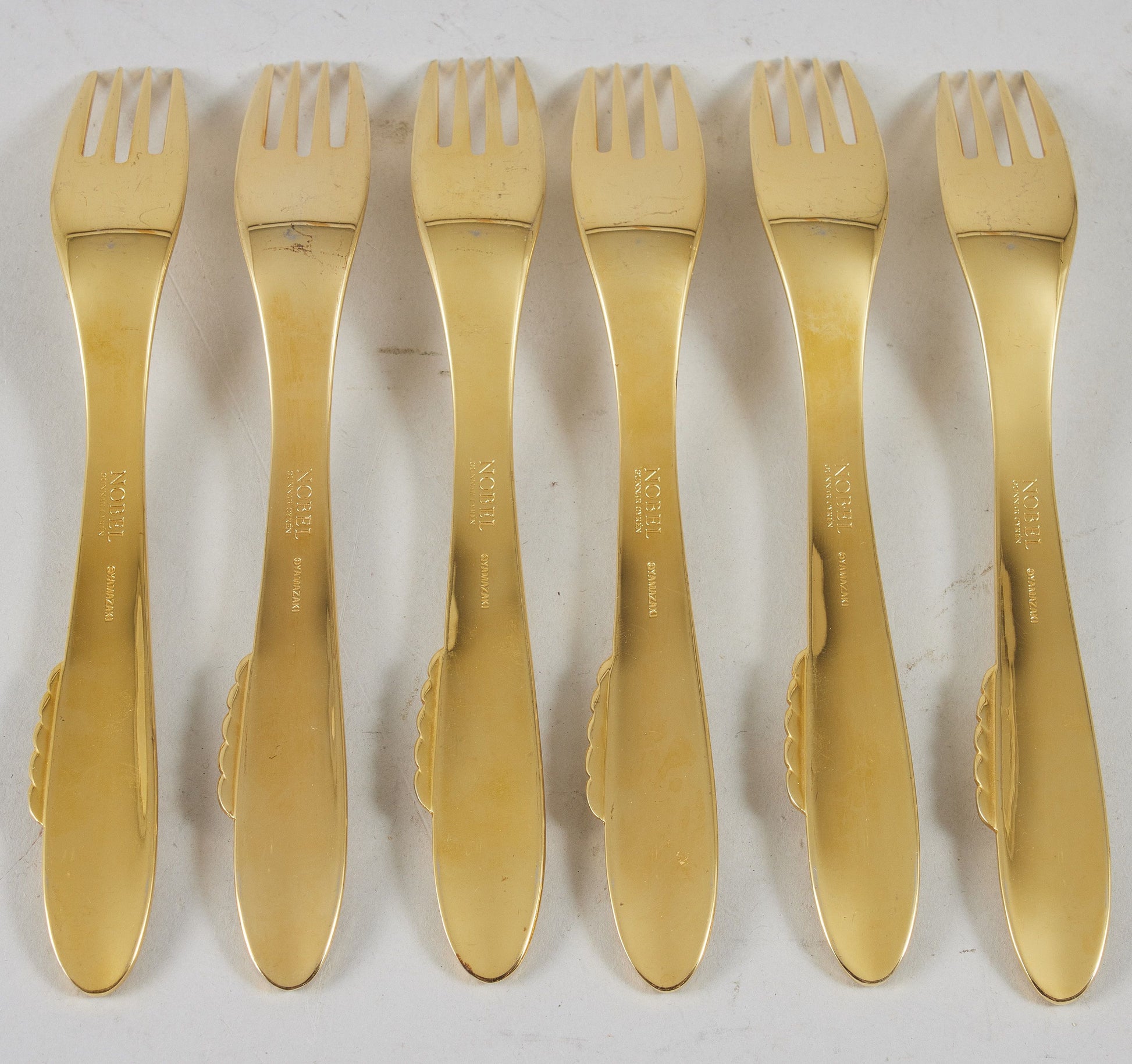 Fiskgaffel av Gunnar Cyrén för Gense. Formgiven till Nobelprisets 90-årsjubileum. Tillverkad i förgyllt rostfritt stål. 18,8 centimeter lång. Pris per styck.