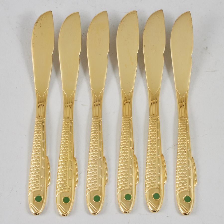 Fiskkniv av Gunnar Cyrén för Gense. Formgiven till Nobelprisets 90-årsjubileum. Tillverkad i förgyllt rostfritt stål. 21 centimeter lång. Pris per styck.