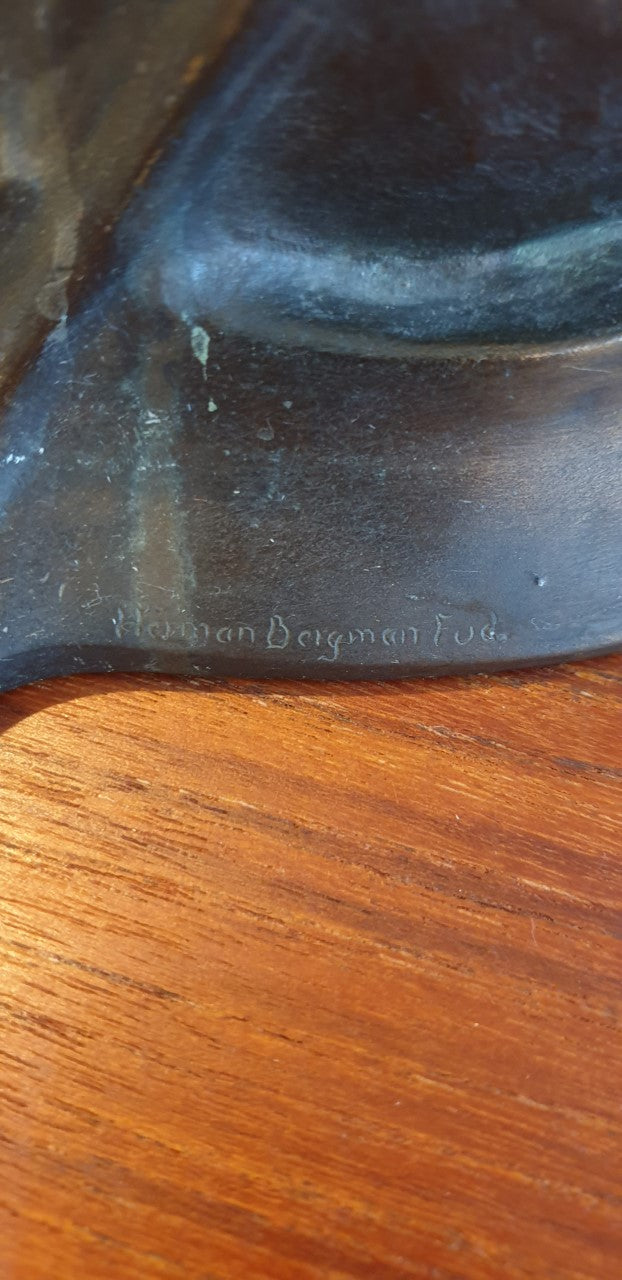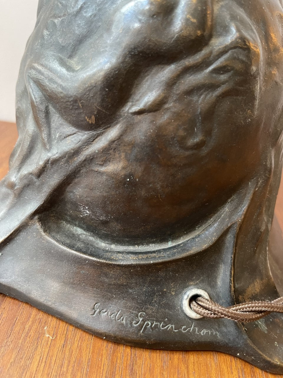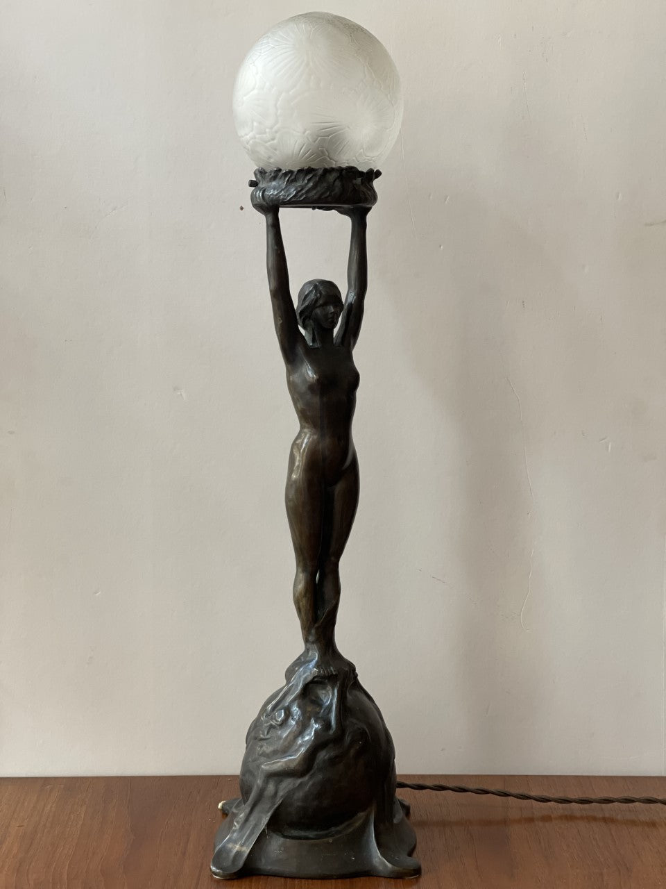 ゲルダ・シュプリンホルン作のブロンズ製アールヌーボー様式のテーブルランプ。ゲルダ・シュプリンホルンとハーマン・バーグマン・ファッドと署名。全高73cm。
