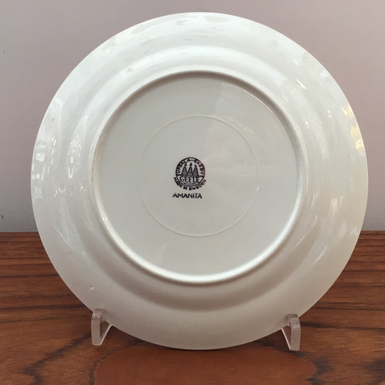 ヘルマー・リングストロムによるゲフレ用の小皿テングタケ属。直径 18.5cm/7.3 インチ。製造年 1949 ~ 1957 年。経年や使用に伴う摩耗。