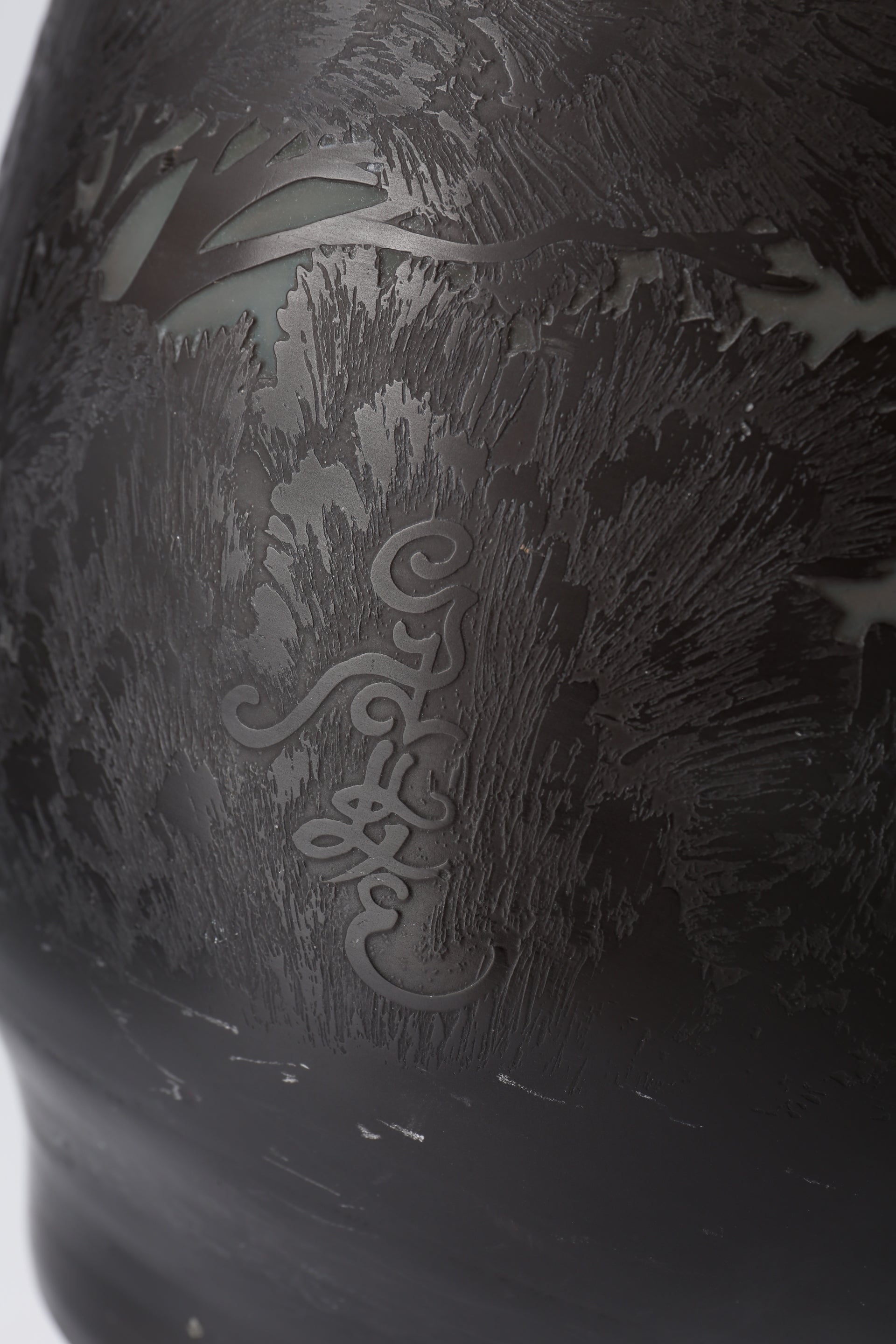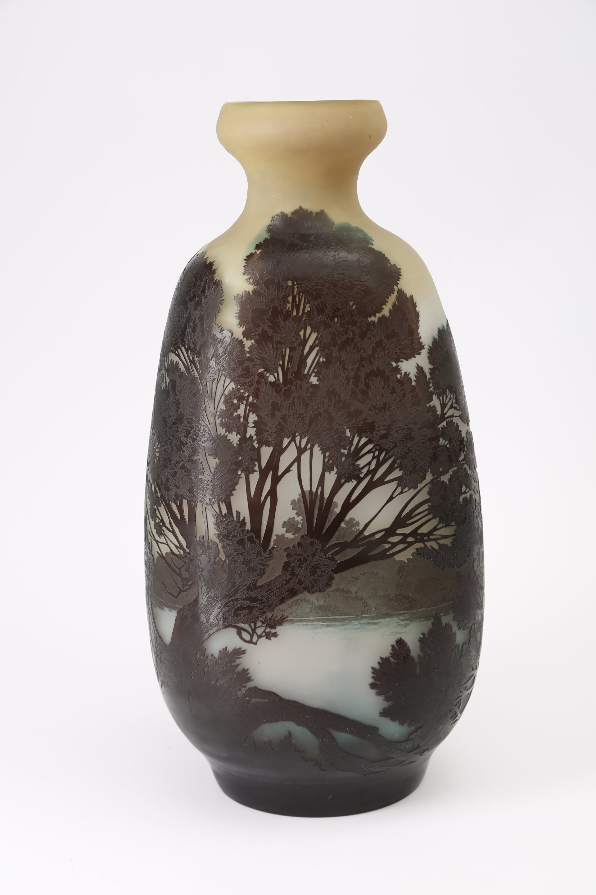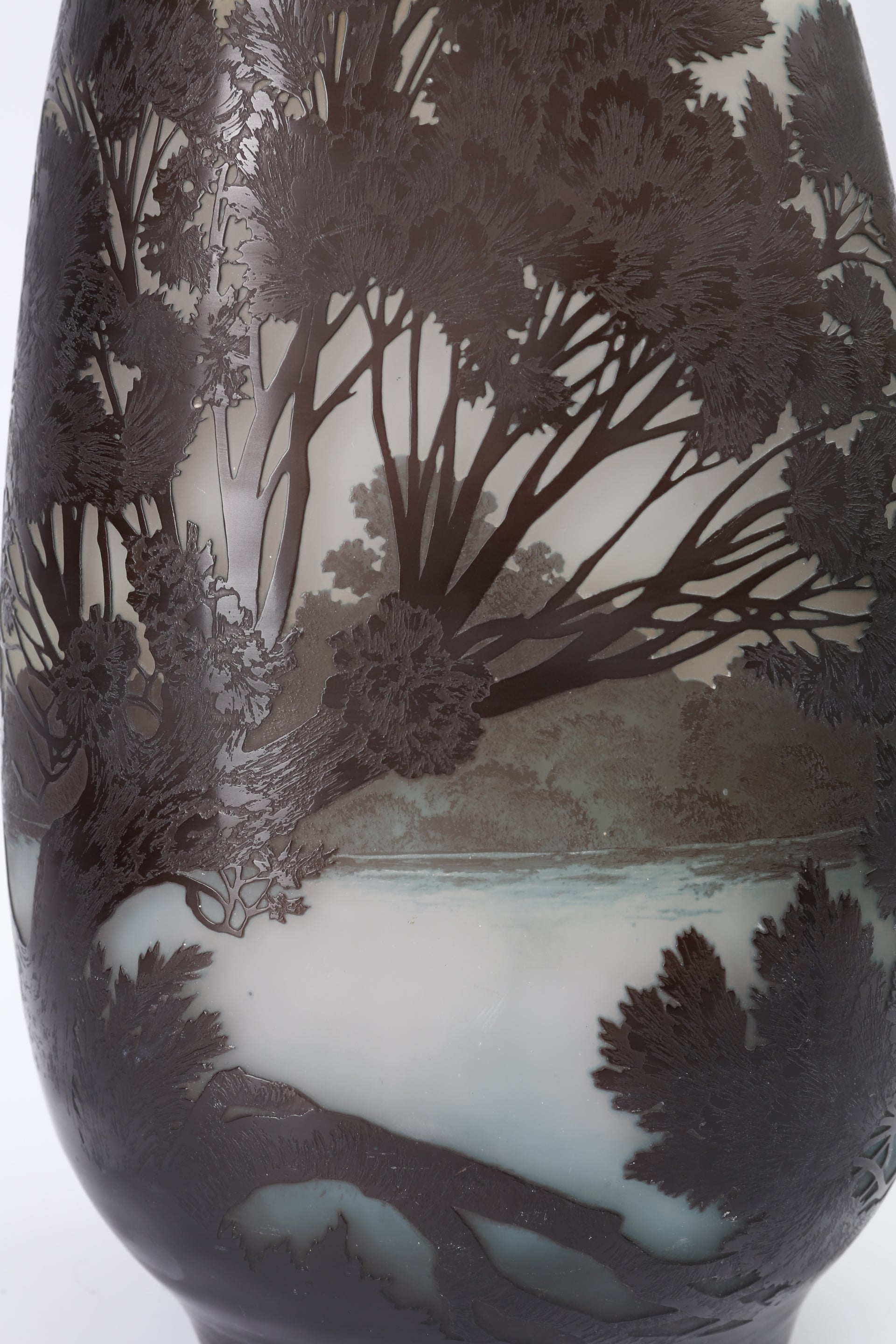 エミール・ガレの花瓶、ナンシー。湖のある森林地帯と背景の城をエッチングした装飾が施されたオーバーキャップ。ガレのサイン入り。高さ44cm。