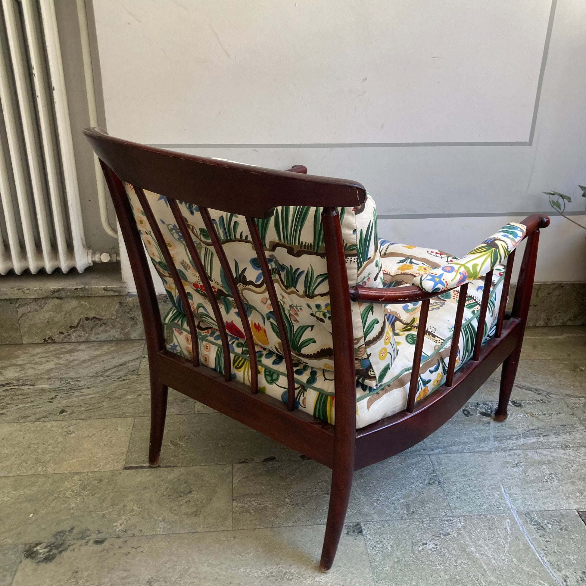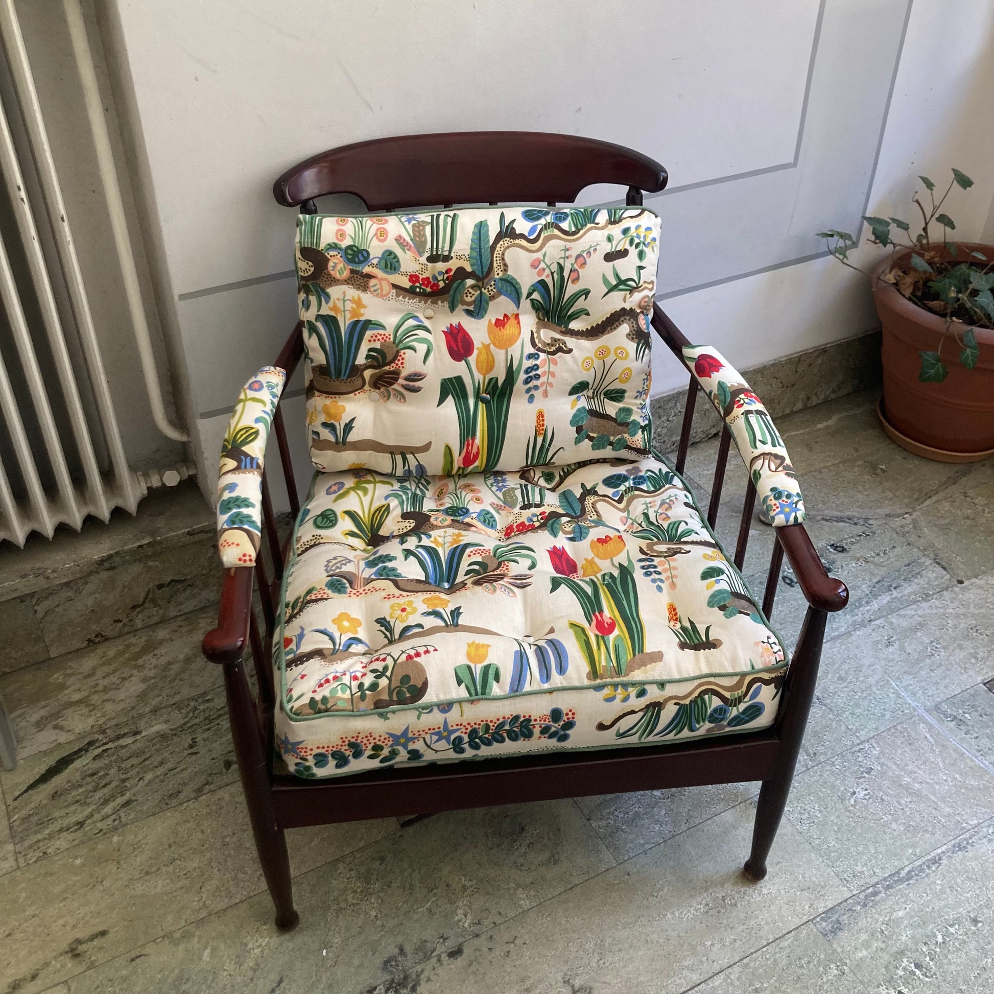 Fåtölj Skrindan av Kerstin Hörlin Holmquist för OPE Möbler, 1960-tal. Nyklädd i tyget Primavera av Josef Frank för Svenskt Tenn. H: 79cm B: 74cm D: 87cm.