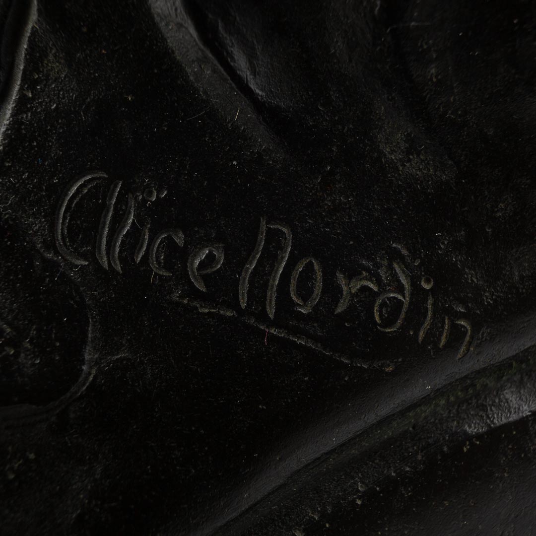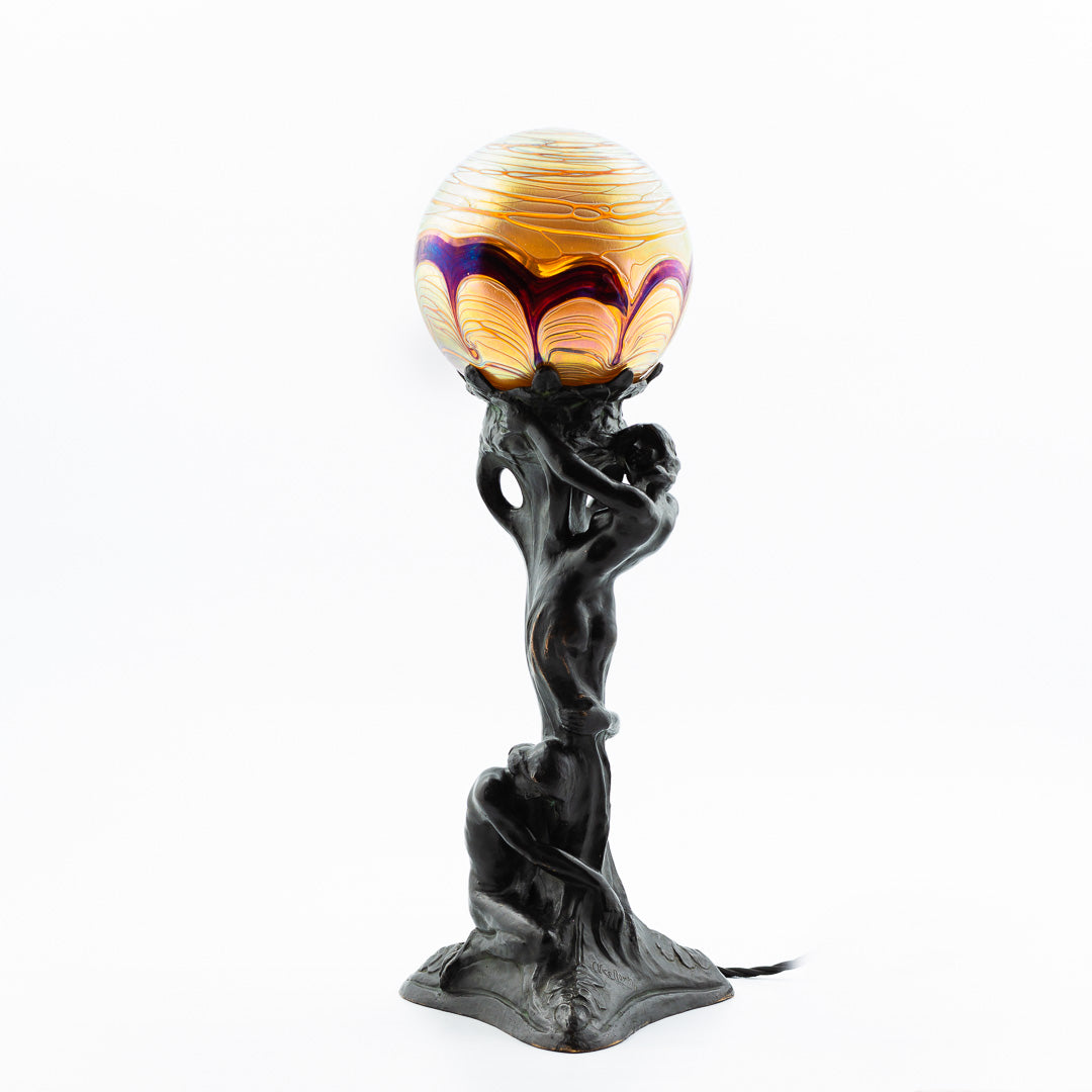 Bordslampa jugend i brons. Av Alice Nordin med kupa i iriserande glas. Totalhöjd: 54,5cm. Signerad Alice Nordin.