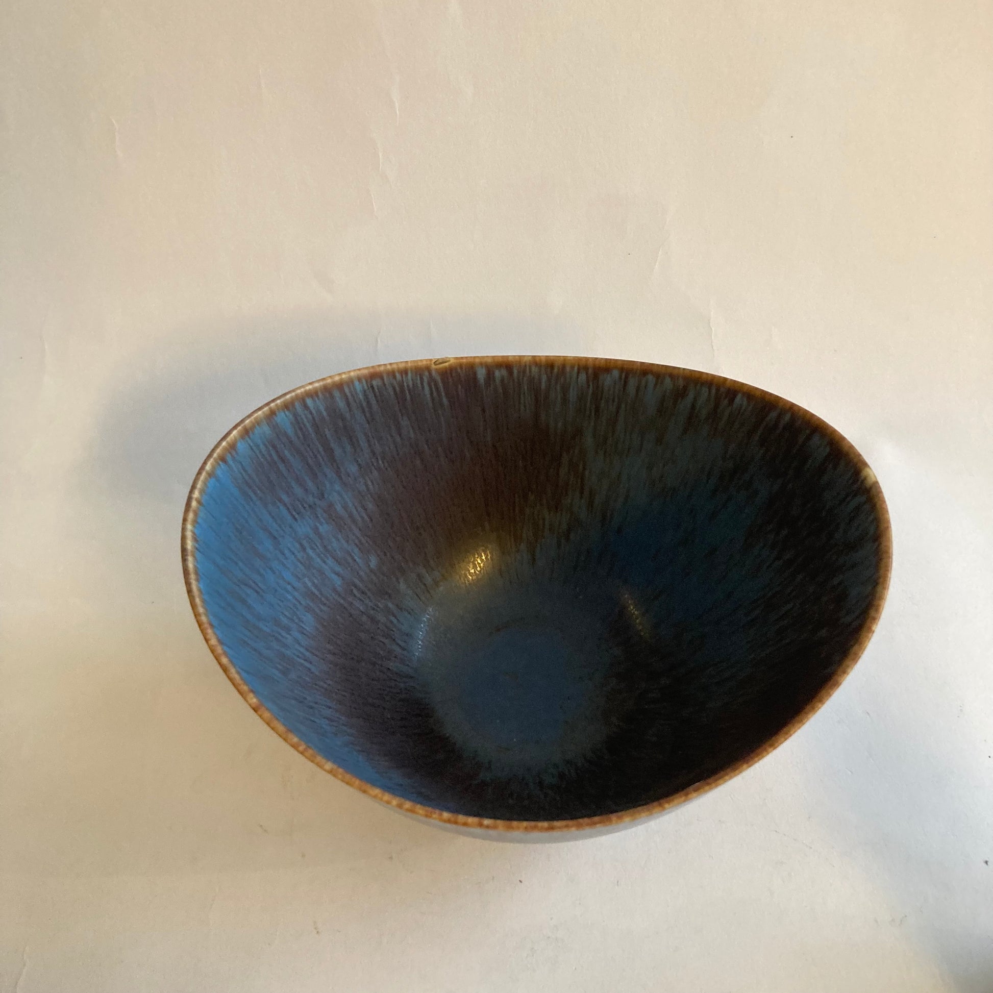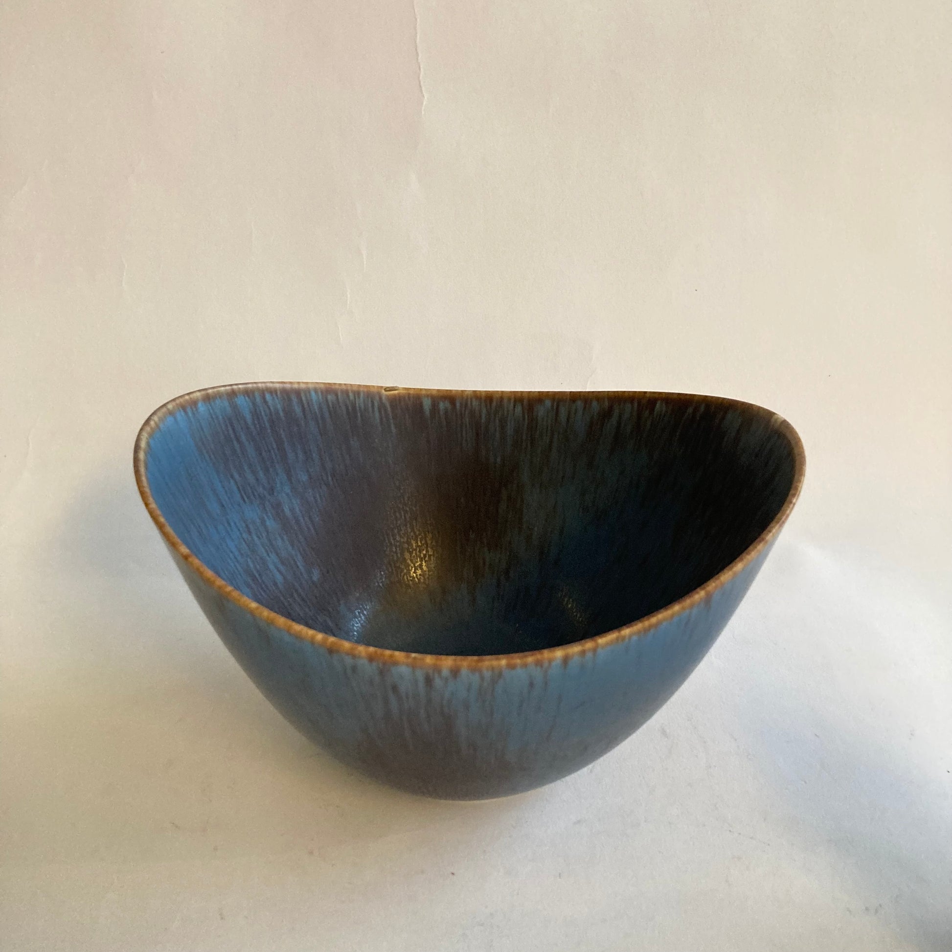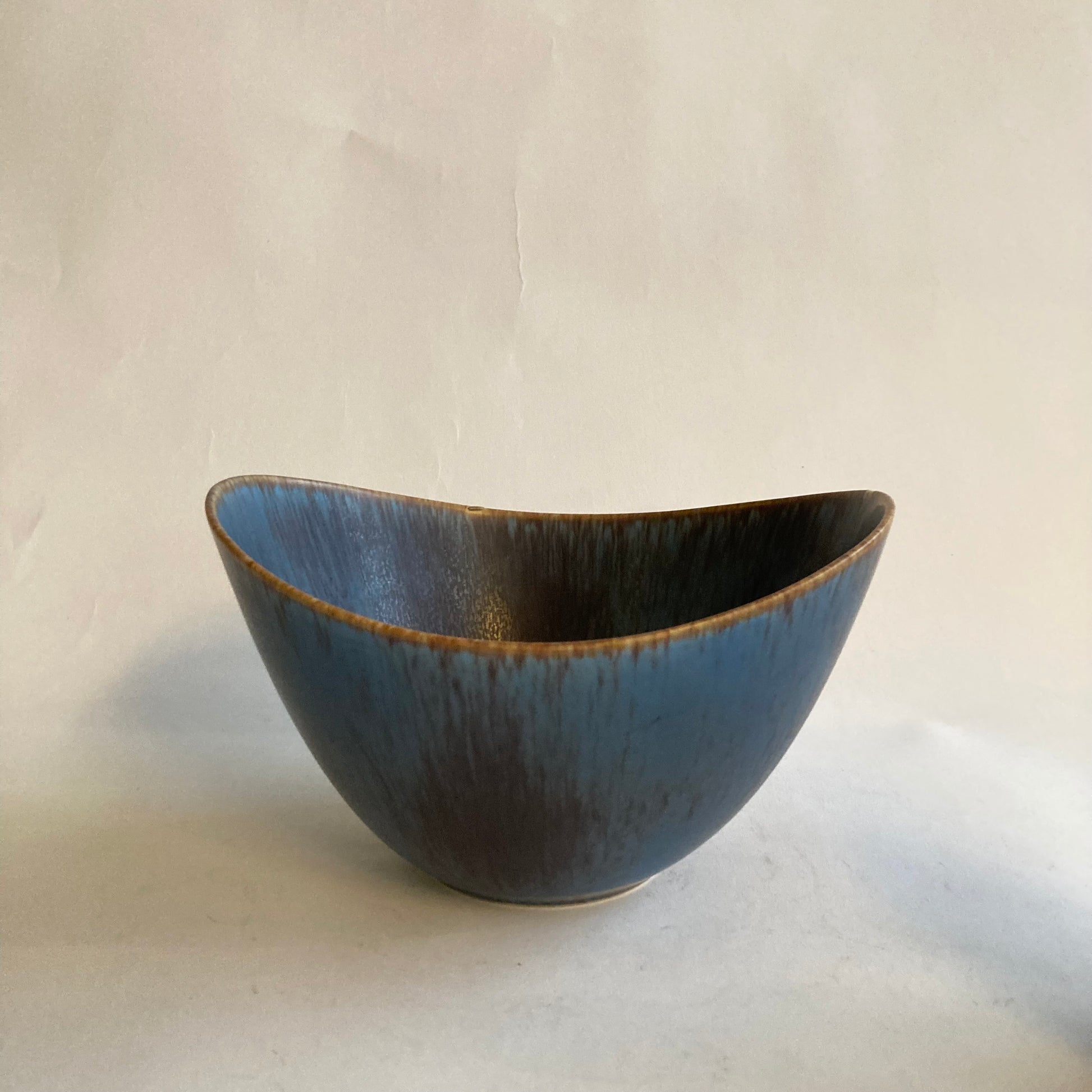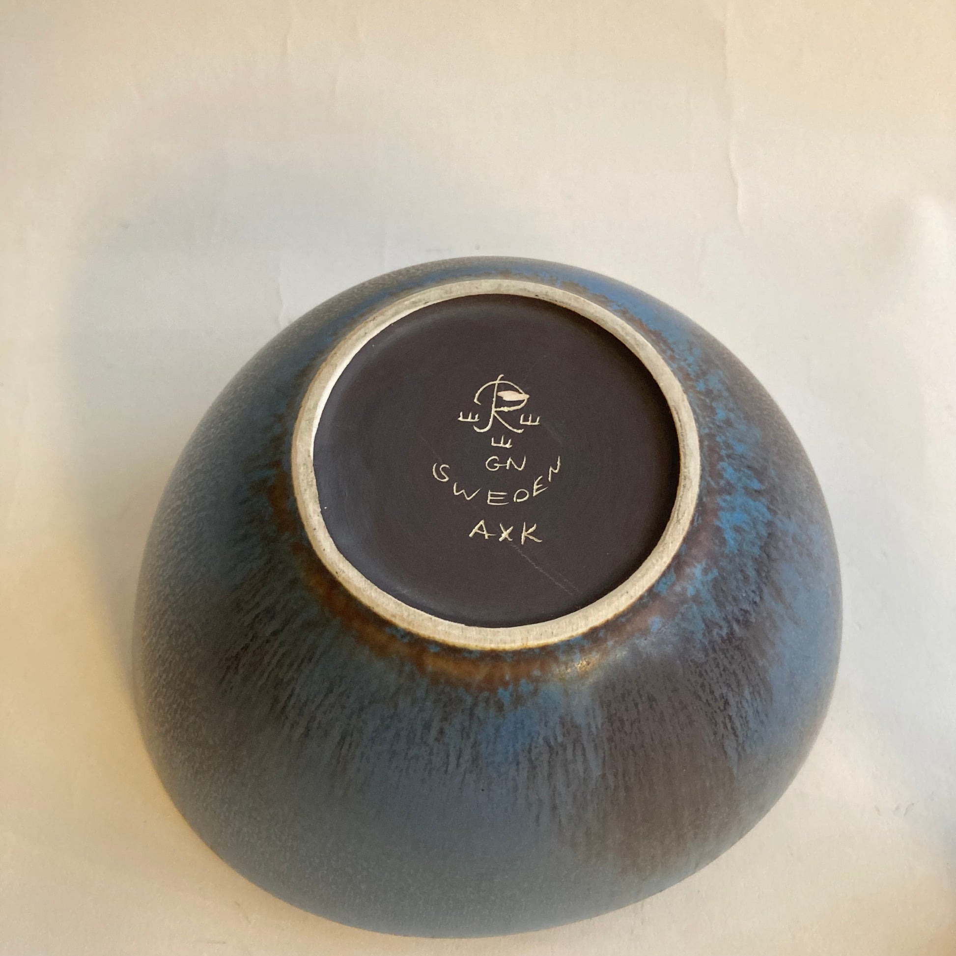 Skål i stengods av Gunnar Nylund för Rörstrand. Signerad R SWEDEN GN AXK. Märkt som andrasortering. 12cm hög samt 20,5cm X 17,5cm.