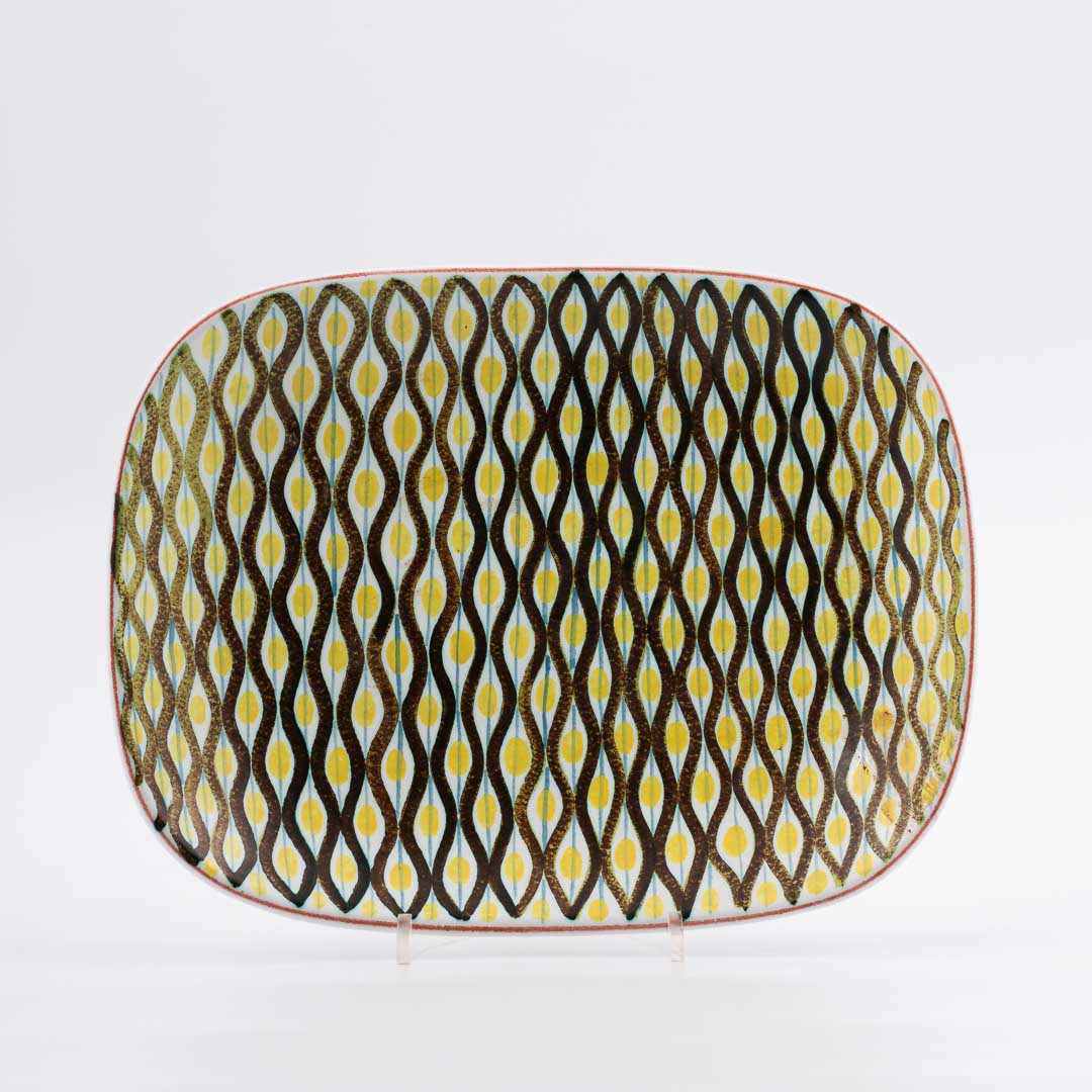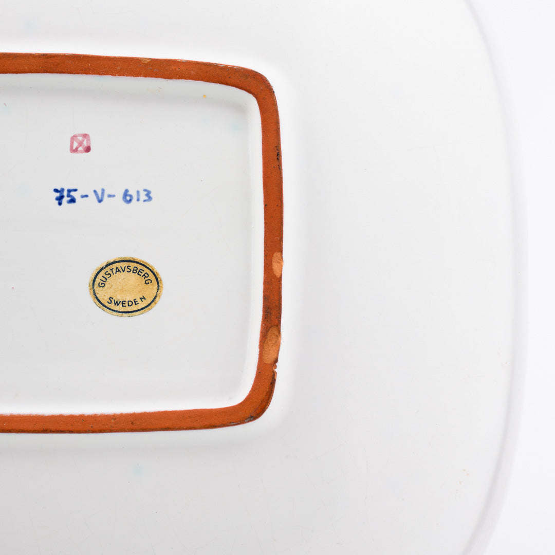 Stig Lindberg fajansfat, från Gustavsberg, 1950-tal. 33cm X 25,5cm. Mindre nagg. Signerad med Studiohanden