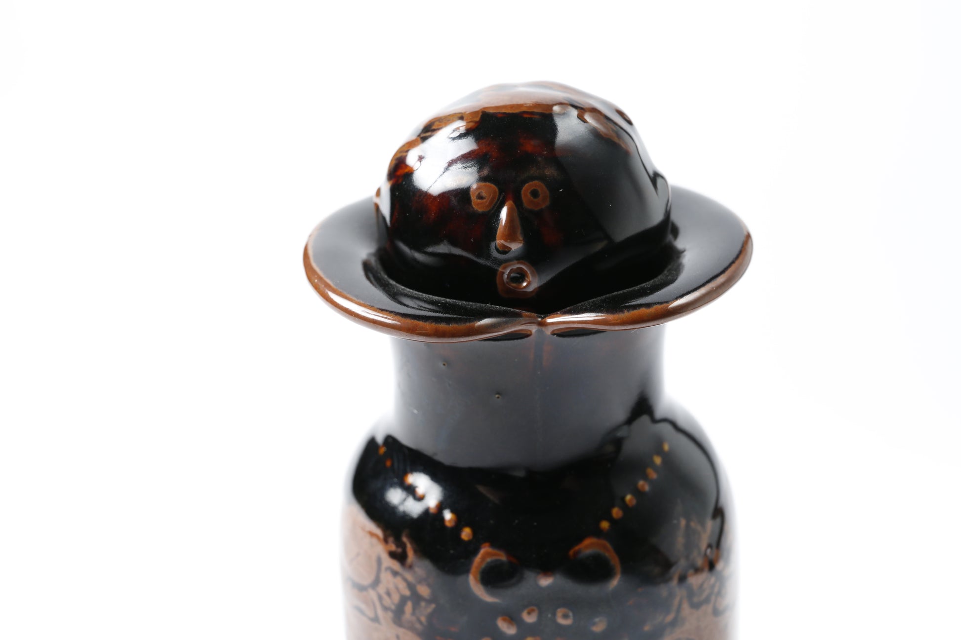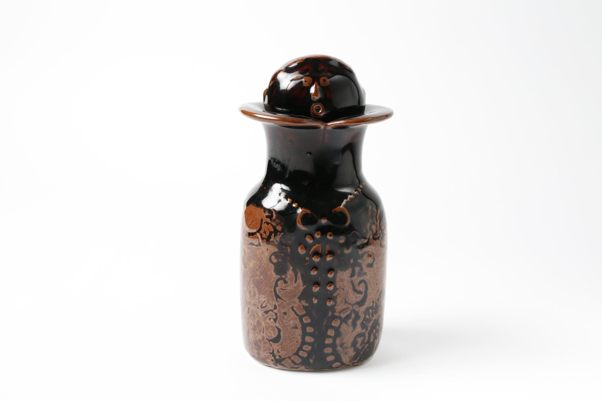 Flaska i stengods av Stig Lindberg för Gustavsberg. 14 cm hög. Signerad Stig L samt studiohanden.