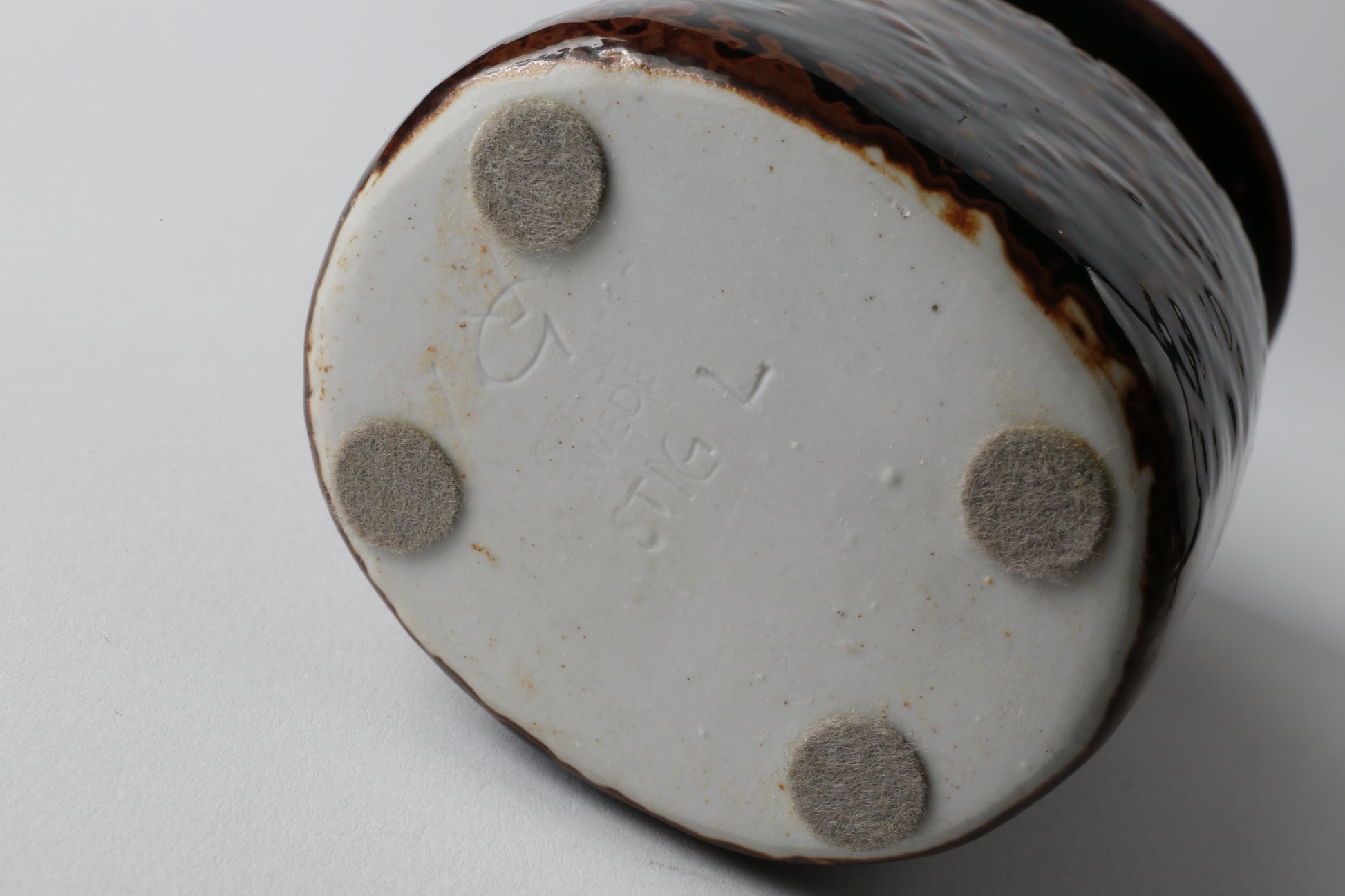 Stoneware bottle by Stig Lindberg for Gustavsberg. H: 14cm/5,5″. Signed Stig L and the Studio Hand