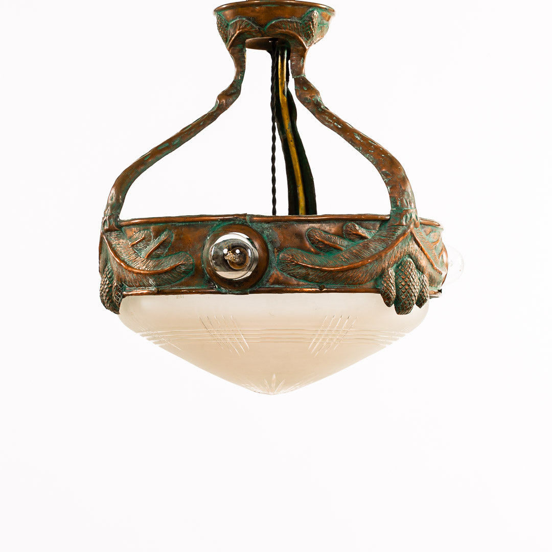 Taklampa jugend med plåt i koppar. Höjd: 55cm och Diameter 50cm.